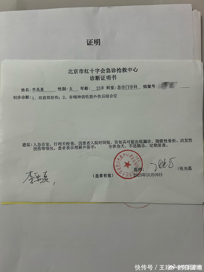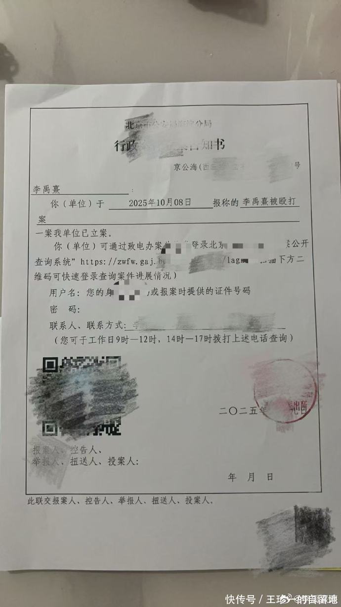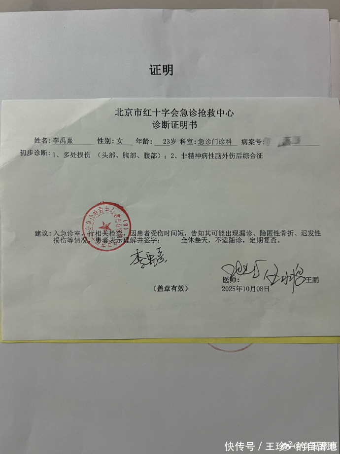 为了证明自己所言非假,在发布长文之后,李禹熹又发布了一条动态,她晒出了她在医院的诊断证明,和警局的立案告知书。